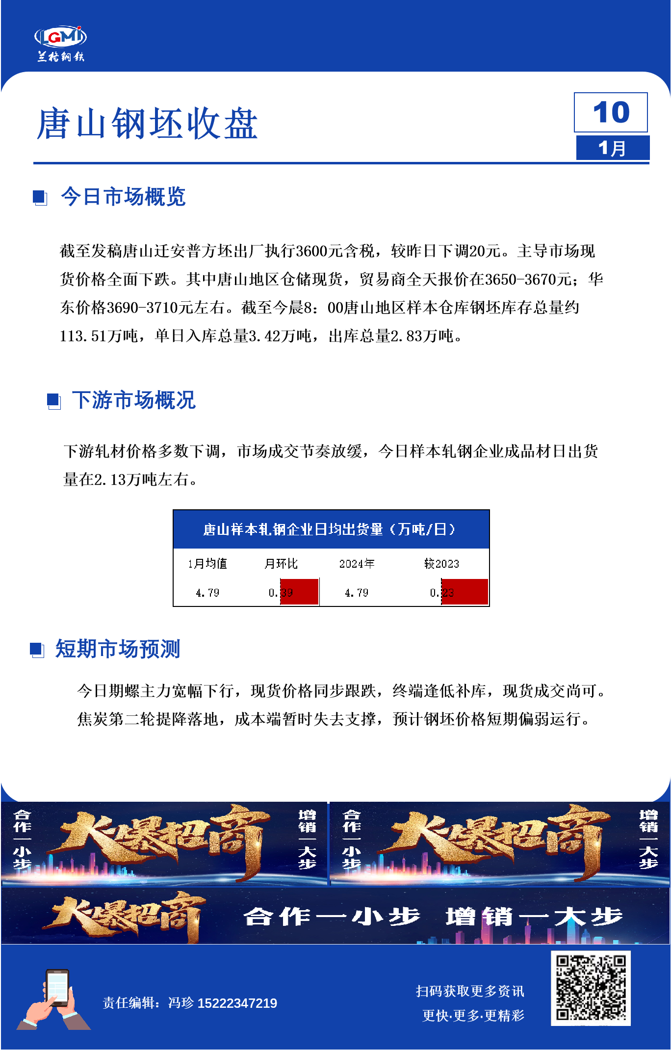 - 唐山钢坯收盘:现货价跌 终端逢低补库2024/1/10