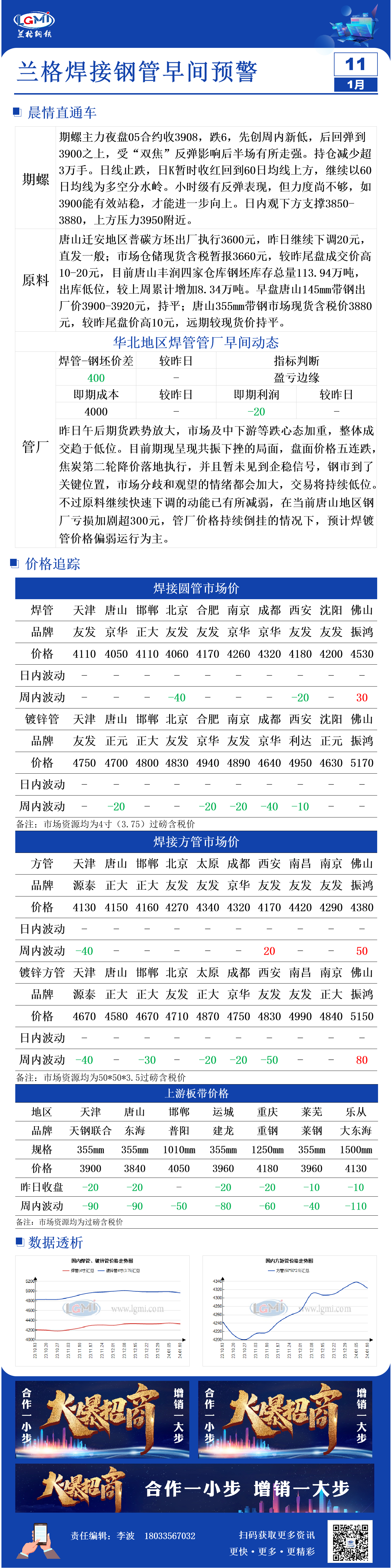 1月11日兰格焊管、镀锌管早间预警