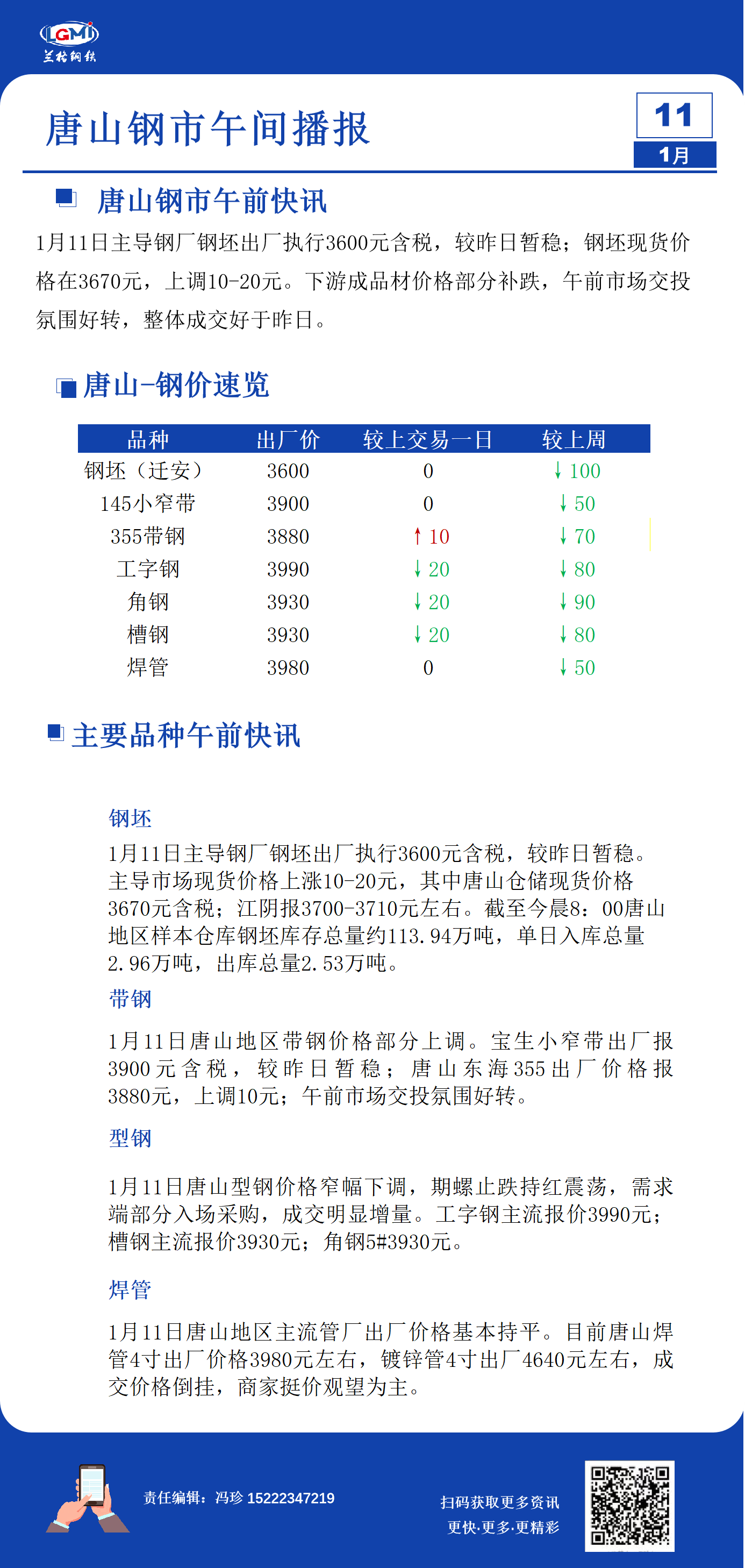 - 1月11日兰格唐山钢市午间播报2024/1/11