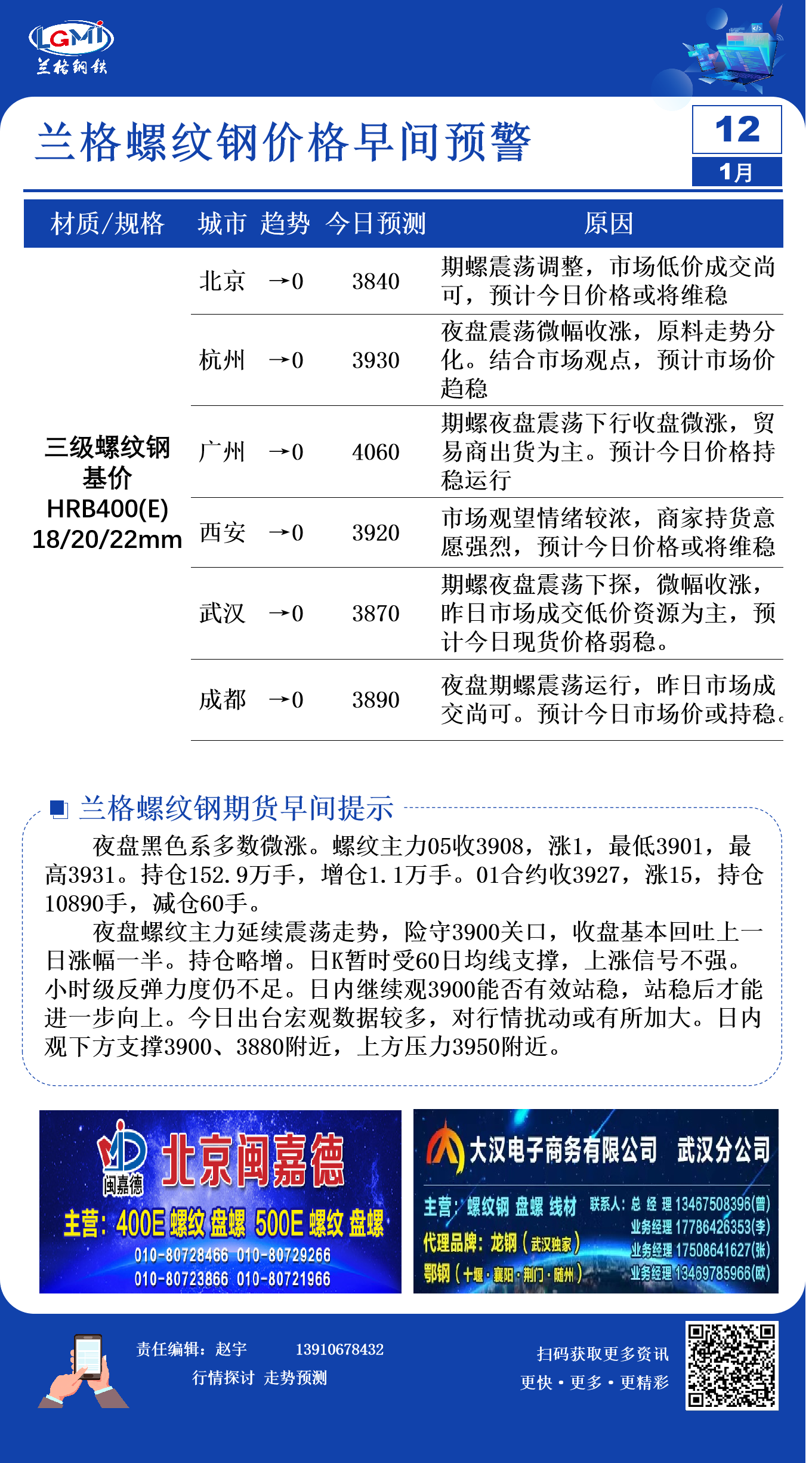- 快讯:1月12日山西晋南钢厂建材出厂价格平稳2024/1/12