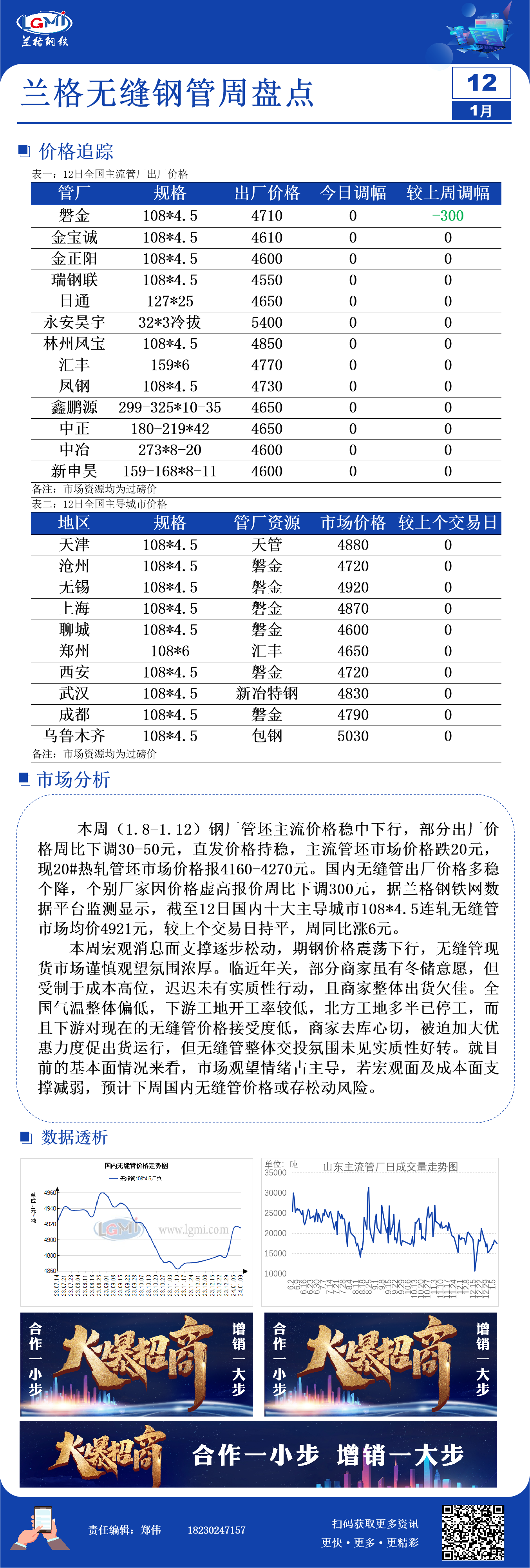 - 兰格无缝钢管周盘点:无缝管市场交投氛围冷清 价格存松动风险2024/1/12