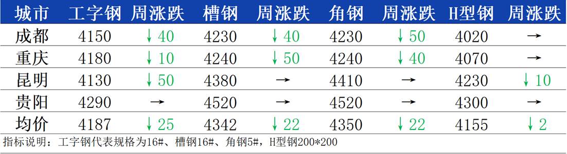 概述:本周西南地区型钢价格窄幅下跌,工槽角川渝地区普降40-50元,H型钢表现出一定韧性,随着传统春节越来越近,交投淡季效应凸显,需求呈现阶段性放量特点,市场心态谨慎偏空,整体库存继续保持低位。