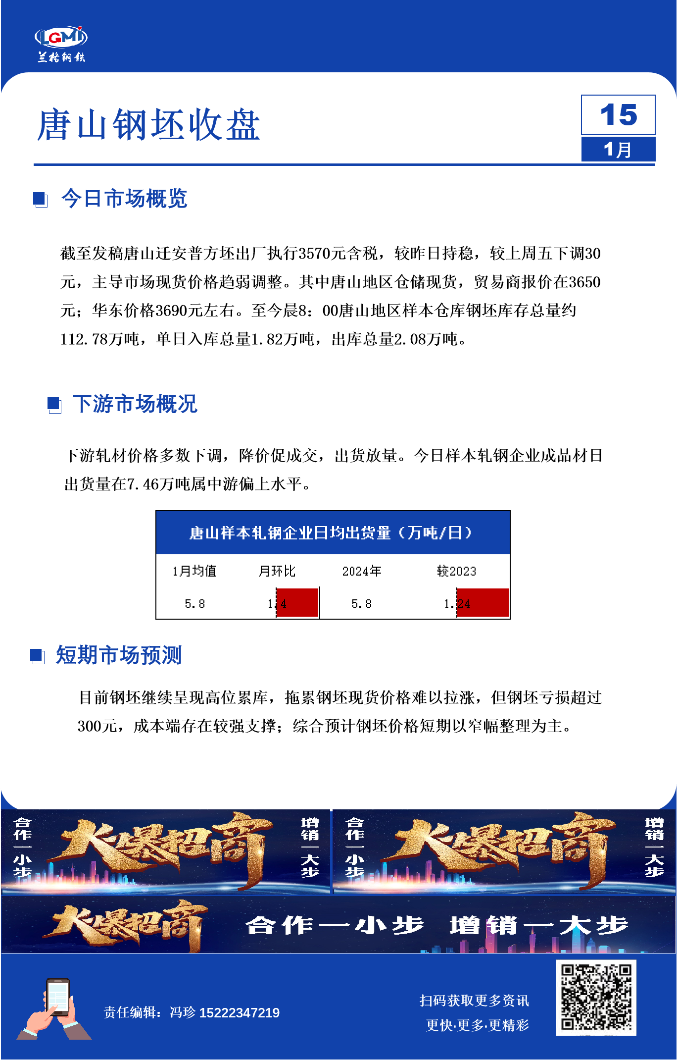 - 唐山钢坯收盘:价格趋弱整理 低价资源成交尚可2024/1/15