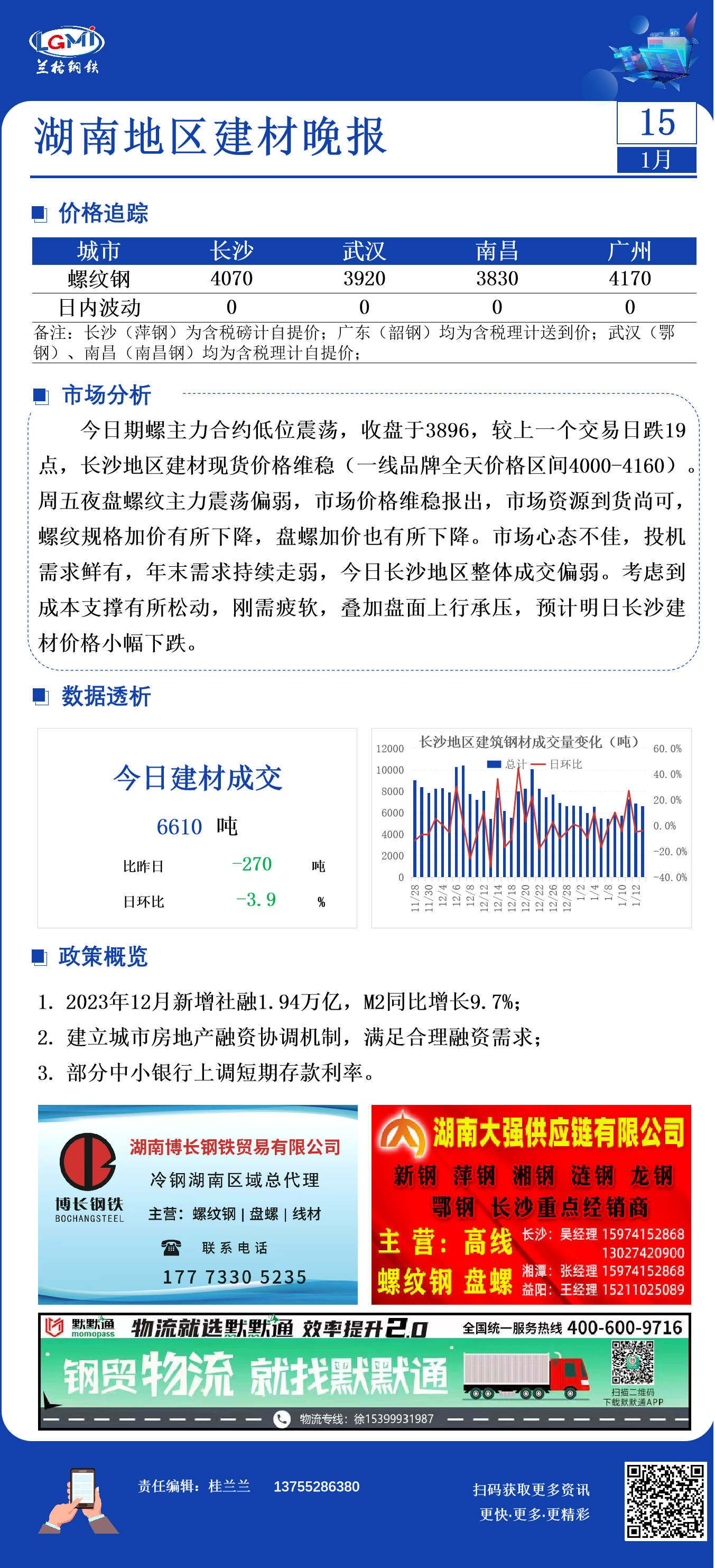 - 长沙建材价格维稳 整体成交偏弱2024/1/15