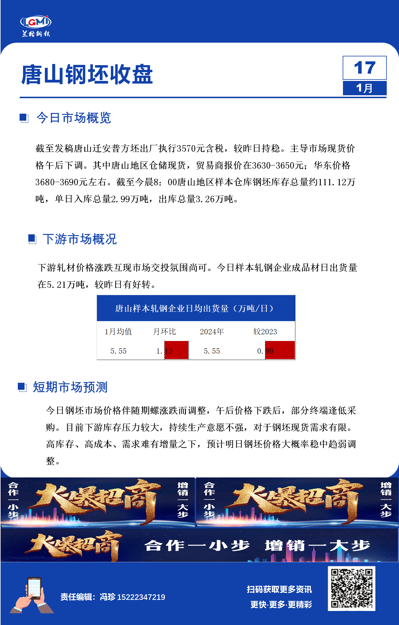 - 唐山钢坯收盘:价格先涨后跌 终端低价收货2024/1/17