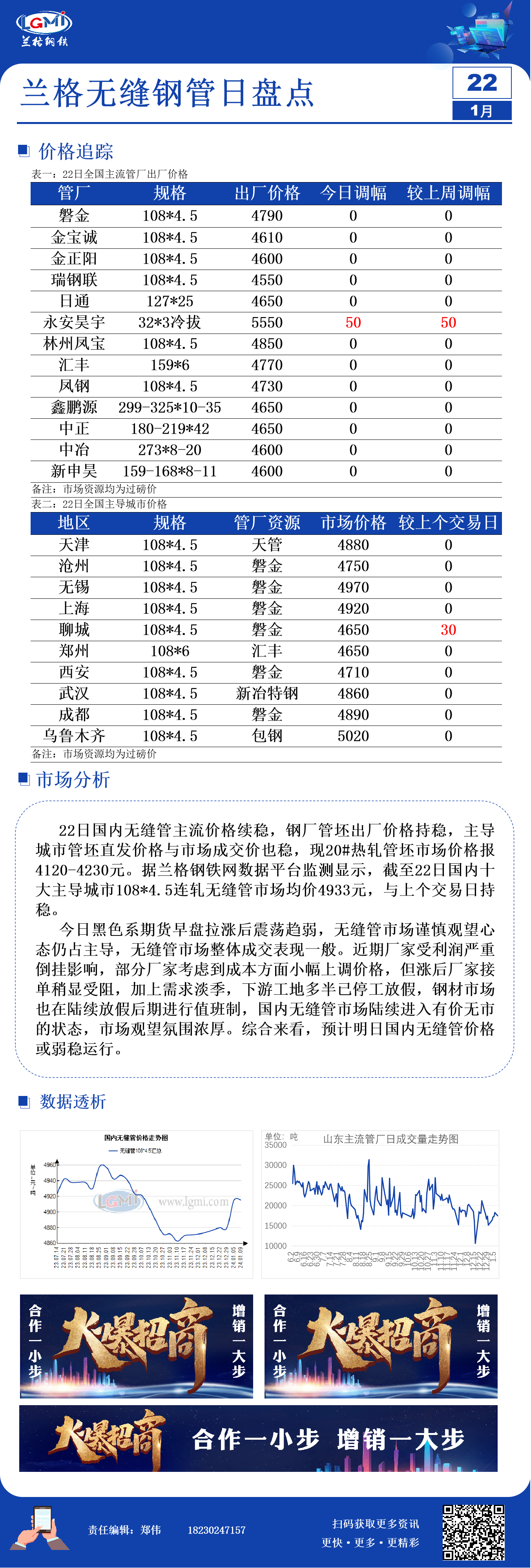 - 兰格无缝钢管日盘点:无缝管市场交投一般 价格弱稳运行2024/1/22