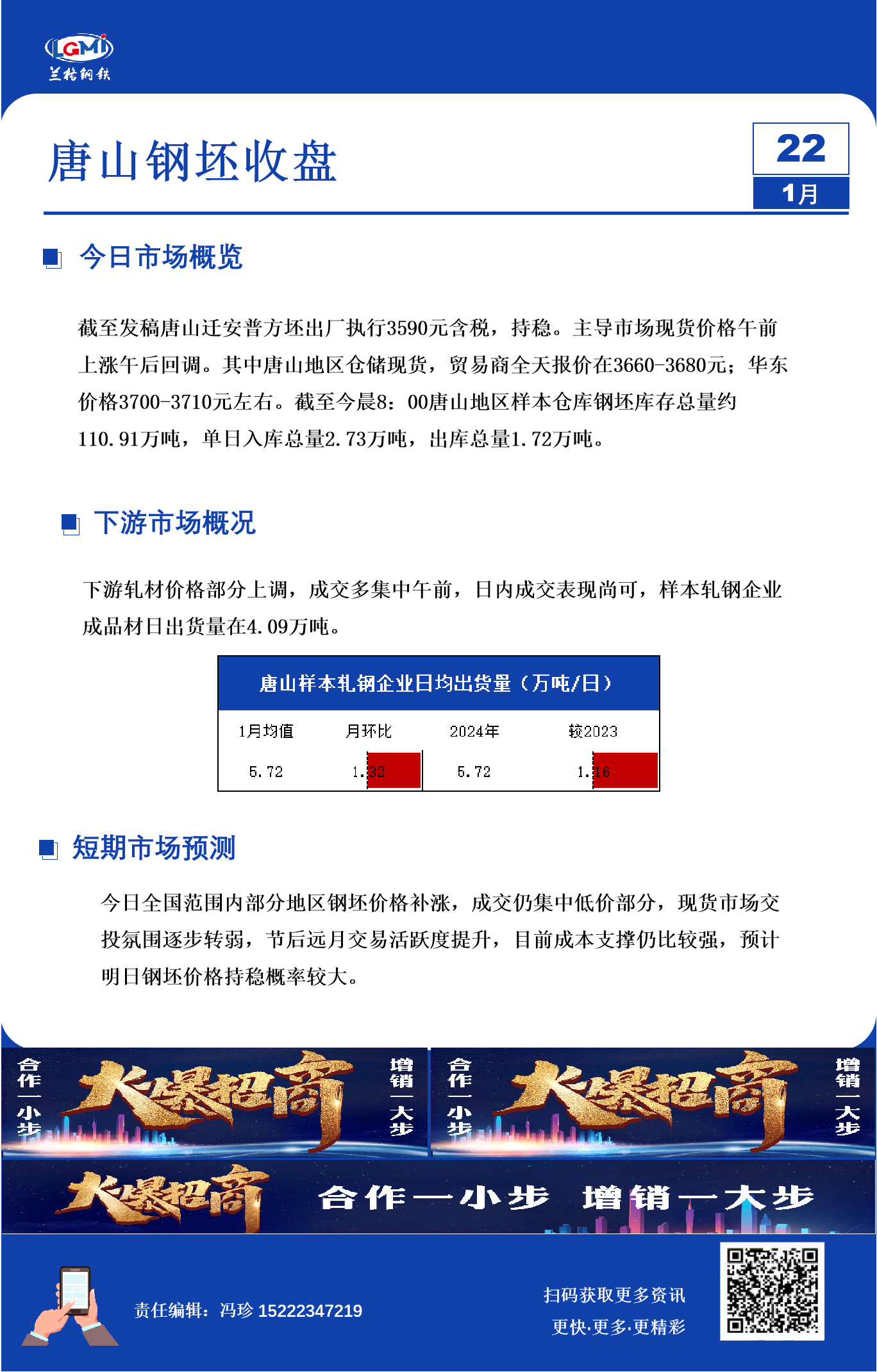 - 唐山钢坯收盘:终端按需采购 午后市场价格回落2024/1/22