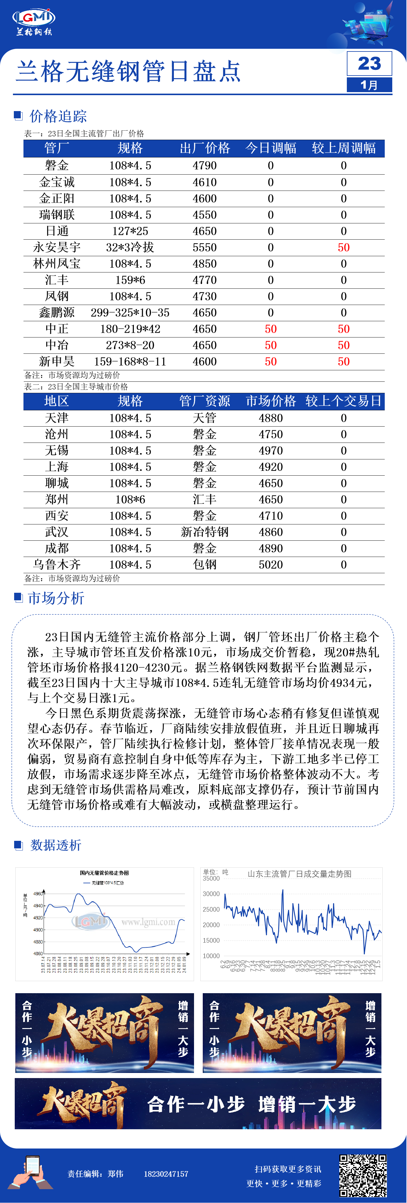 - 兰格无缝管日盘点:供需格局难改 国内无缝管市场或横盘整理2024/1/23