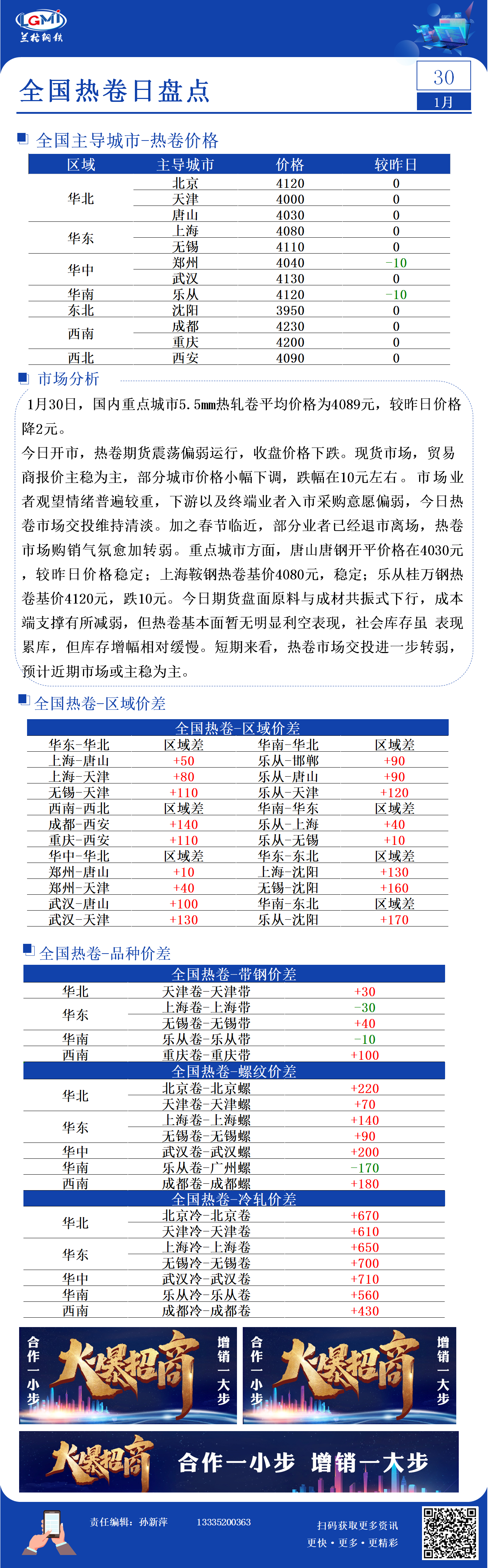 - 1月30日唐山东华建筑钢材出厂价格下调30元2024/1/30