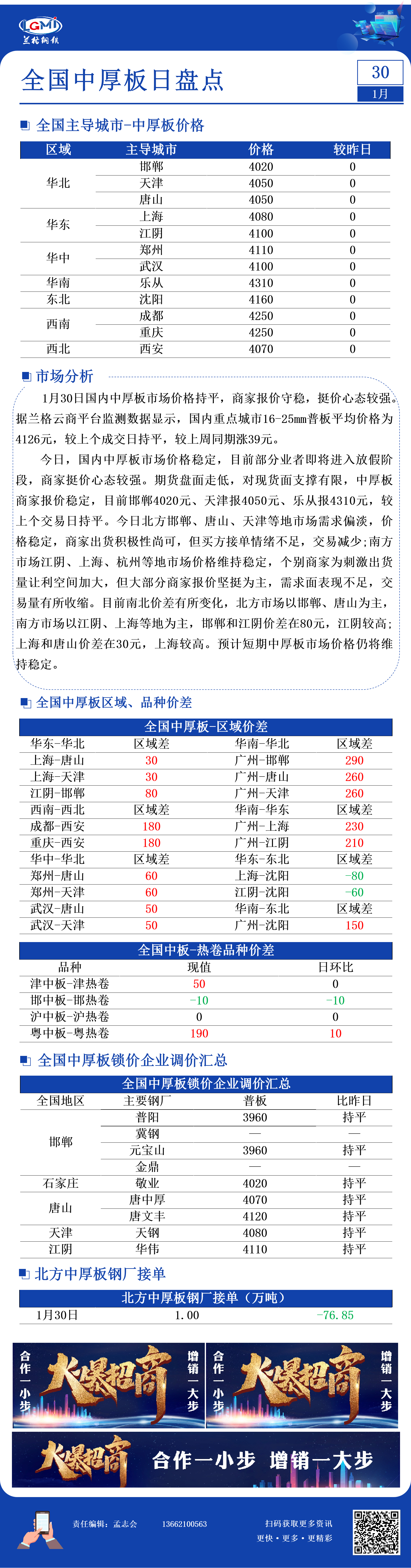 - 兰格中厚板日盘点:市场价格稳定 需求面有所减弱2024/1/30