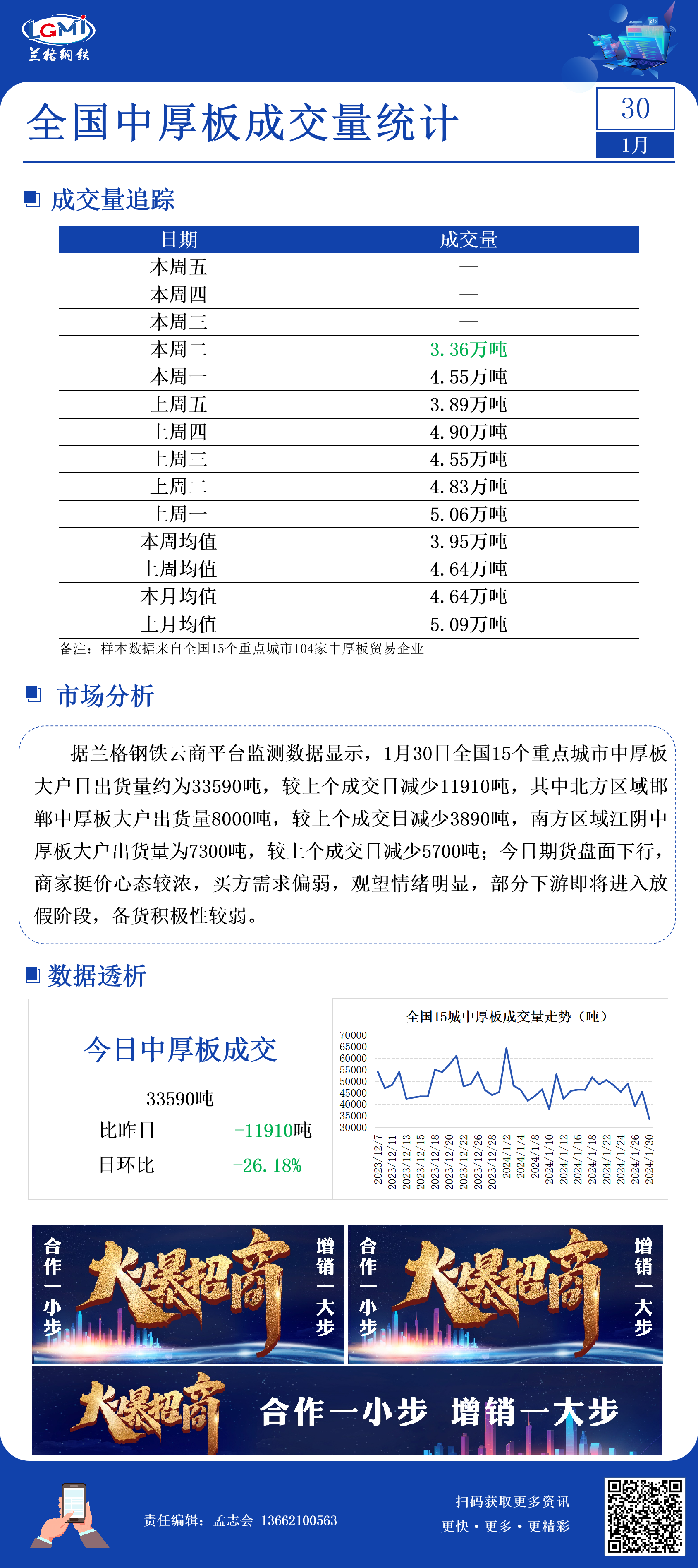- 1月30日全国15个重点城市中厚板大户日成交量减少2024/1/30