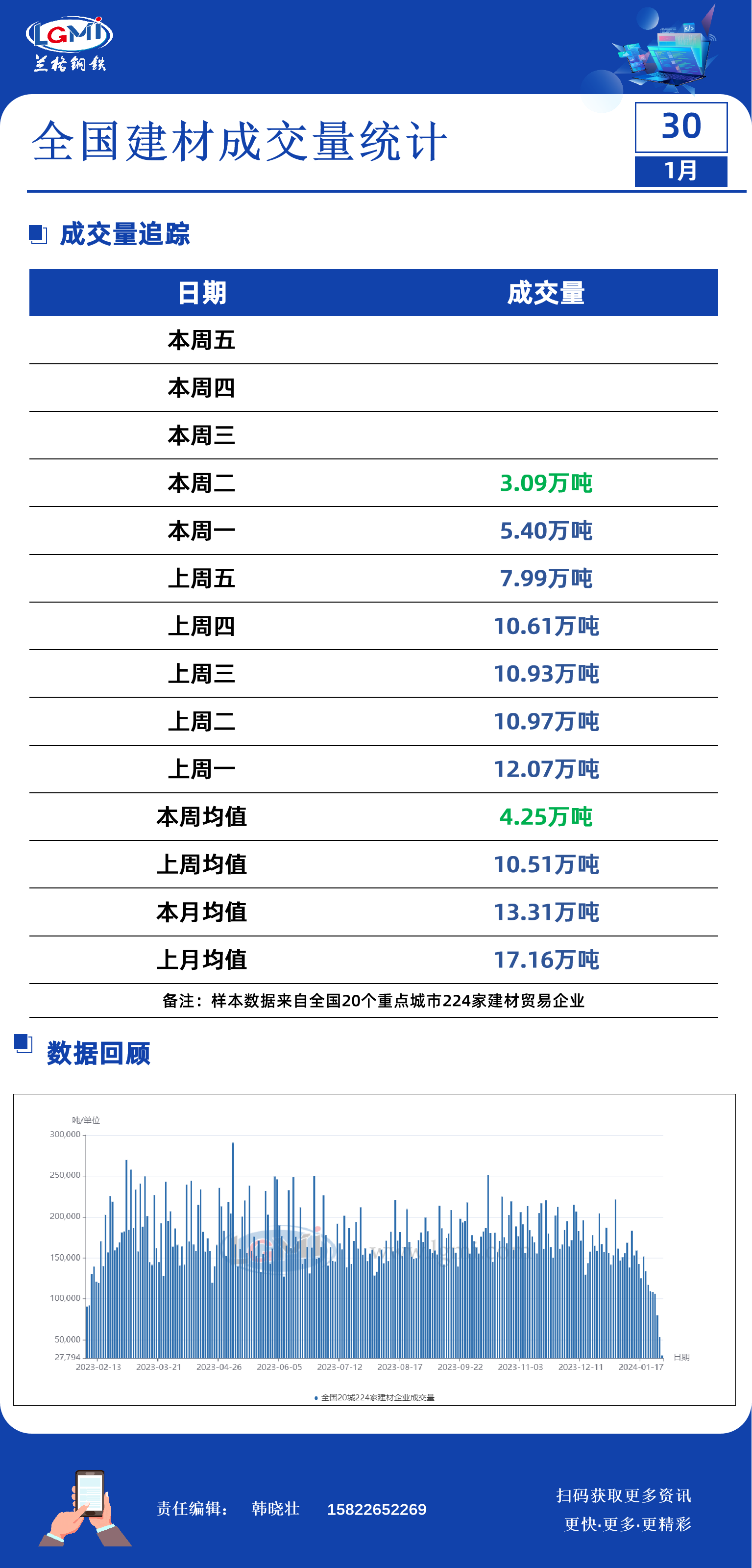 - 1月30日全国建材成交量小幅减少2024/1/30