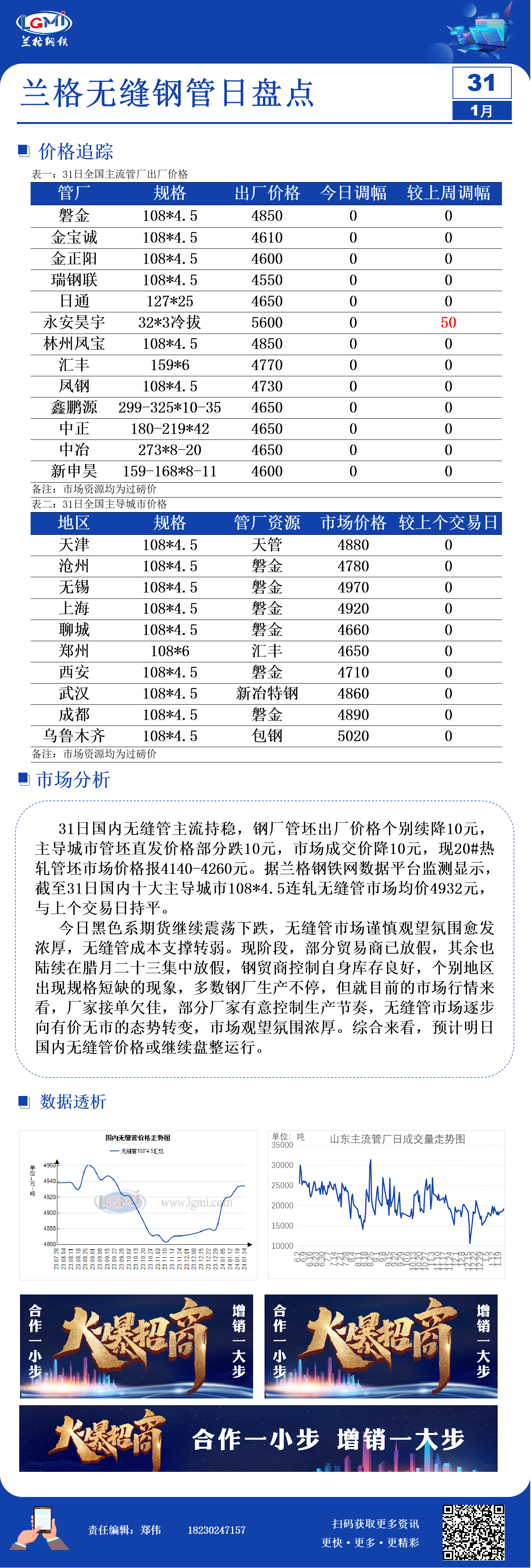 - 兰格无缝钢管日盘点:无缝管主流价格持稳 市场氛围冷清2024/1/31