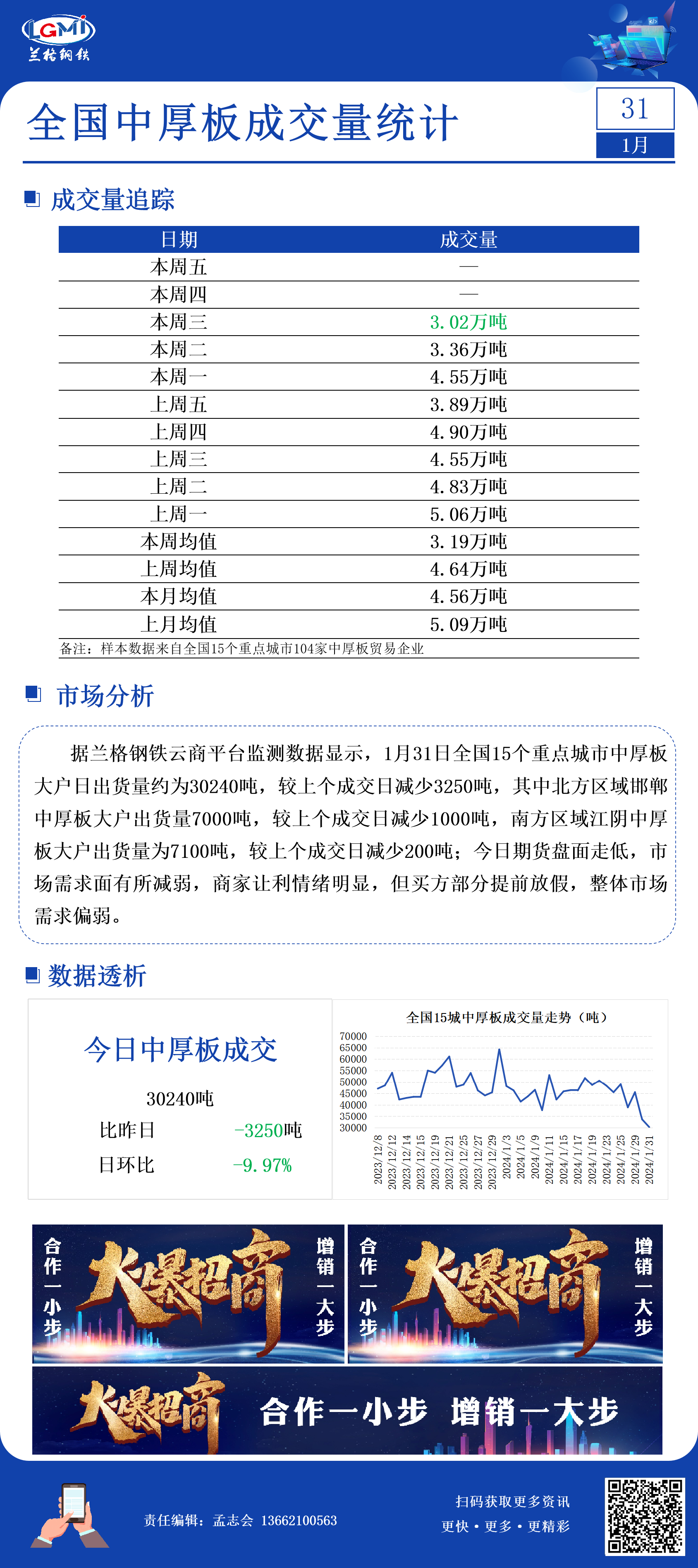 - 1月31日全国15个重点城市中厚板大户日成交量减少2024/1/31