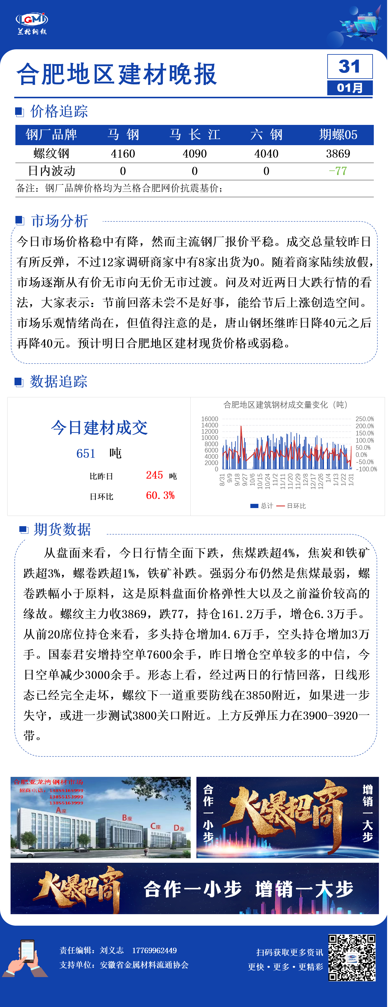 - 快讯:1月31日安徽长江钢铁合肥区域建材出厂价格稳2024/1/31