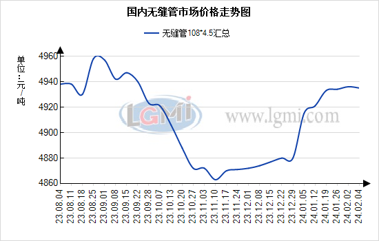 4日国内无缝管价格持稳运行,钢厂管坯出厂价格持稳运行,主导城市管坯直发价格与市场成交价持稳运行,现20#热轧管坯市场价格报4140-4250元。据兰格钢铁网数据平台监测显示,截至4日国内十大主导城市108*4.5连轧无缝管市场均价4935元,与上个交易日降1元。
