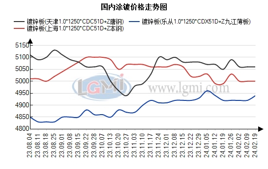 2月19日国内涂镀板卷价格主稳个调。据兰格钢铁云商平台监测数据显示:现国内重点城市1.0mm镀锌板平均价格5003元,较上一个交易日价格上涨3元。其中,天津1.0mm镀锌板价格5500元,较上一交易日价格持平;上海1.0mm镀锌板价格5000元,较上一交易日价格持平;乐从1.0mm镀锌板价格4970元,较上一交易日价格持平。现国内重点城市0.47mm彩涂板平均价格6082元,较上一个交易日价格持平。其中,天津0.47mm彩涂板价格5500元,较上一交易日价格持平;上海0.47mm彩涂板价格6800元,较上一交易日价格持平;广州0.47mm彩涂板价格6450元,较上一交易日价格持平。