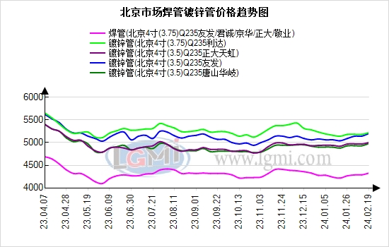 2月19日,北京市场焊管镀锌管价格不同程度跟涨。据兰格钢铁云商平台监测数据显示:焊管4寸(3.75mm)价格为4330元,比上一交易日价格上涨40元;镀锌管4寸(3.75mm)利达5220元,友发5200元,正大5000元,唐山华岐4980元,比上一交易日价格上涨30-60元。