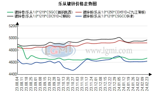2月23日,乐从地区镀锌价格持稳运行。据兰格钢铁云商平台监测数据显示,现镀锌1.0mm价格:宝钢湛江5340元,本钢4920元,鞍钢4960元,首钢凯西4670元,攀钢5270元,马钢5150元,柳钢4970元,首钢5190元,九江薄板4920元,华津4620元,含税。