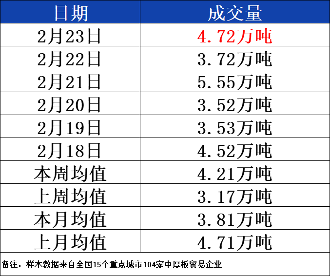 据兰格钢铁云商平台监测数据显示,2月23日全国15个重点城市中厚板大户日出货量约为47170吨,较上个交易日增加9940吨,其中北方区域邯郸中厚板大户出货量9700吨,较上个交易日增加3950吨,南方区域江阴中厚板大户出货量为13000吨,较上个交易日增加2600吨;今日期货盘面表现震荡,中厚板贸易商出货积极性尚可,买方需求有所释放,成交量增加。