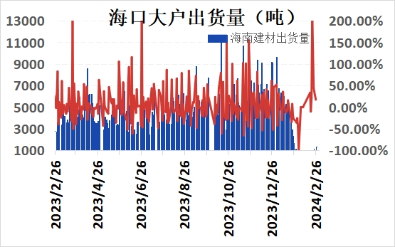 市场方面,今日期螺盘面全天偏弱运行,低开低走,整体大幅收跌。目前市场来看,周末元宵节后,终端陆续复工,本周开始需求有望逐步恢复,但盘面持续低位盘整,市场情绪悲观谨慎,市场多低价成交为主。26日兰格钢铁网调研了解海口地区建材贸易商10家样本贸易商合计出货1350吨,较上交易日增加200吨。预计明日海口建材价格偏弱为主。