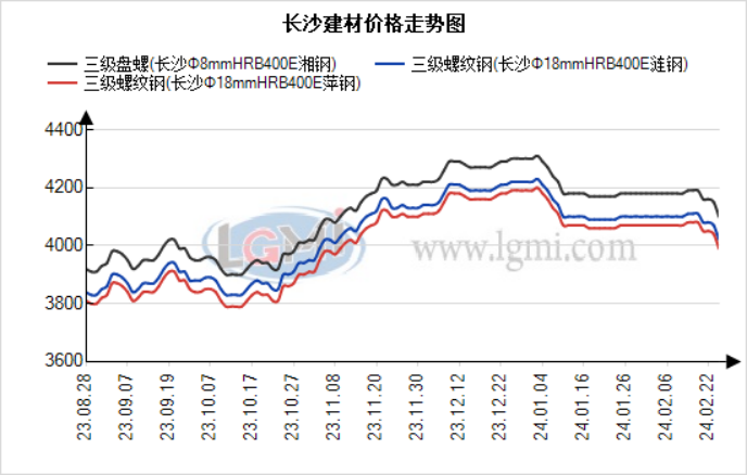 今日长沙建材现货价格明显下跌。据兰格钢铁研究中心监测显示:截至26日长沙建材市场HRB400EΦ18mm螺纹钢涟钢4020元,冷钢3990元,萍钢3990元;HRB400EΦ8mm盘螺湘钢4100元。