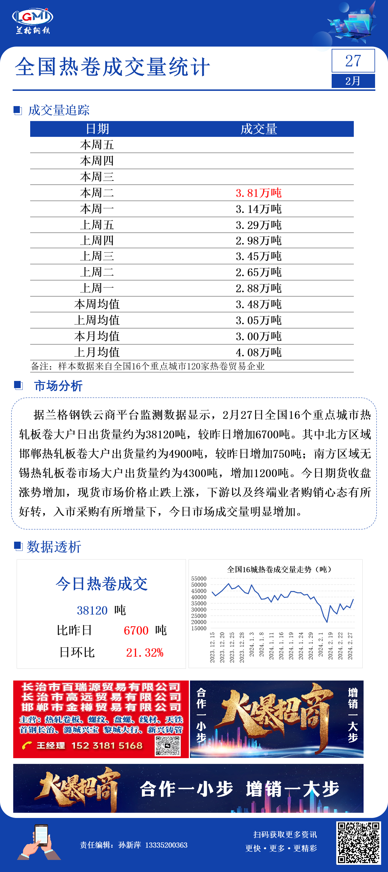 - 2月27日全国16个城市热轧板卷大户日成交量增加2024/2/27