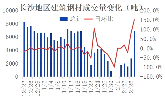 今日长沙10家样本贸易商建材成交6900吨,较上一工作日增加4140吨。长沙市场现货成交有明显的增量,终端需求开始启动,提货有所增量,市场交易氛围转暖。