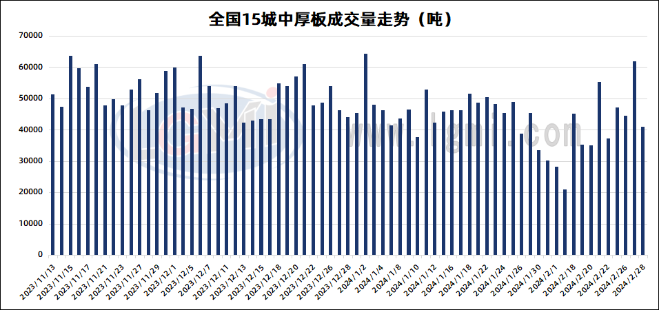 据兰格钢铁云商平台监测数据显示,2月28日全国15个重点城市中厚板大户日出货量约为41140吨,较上个交易日减少20880吨,其中北方区域邯郸中厚板大户出货量8500吨,较上个交易日减少3100吨,南方区域江阴中厚板大户出货量为9100吨,较上个交易日减少12300吨;今日期货盘面偏弱震荡,业者交易情绪一般,终端大多消耗前期库存,采购情况一般。