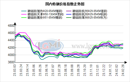 2月29日国内优特钢市场价格主稳。据兰格钢铁云商平台监测数据显示,国内重点城市,45#碳结钢85mm平均报价4364元,40Cr合结钢85mm平均报价4554元,较上个交易日价格持稳。