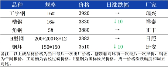 钢厂端:昨日成本端唐山地区普碳方坯资源出厂价格窄幅下行10元至3510元,今日调坯企业出厂价格主稳个降,期货电子盘面高开低走,下游市场观望心态不改,市场交投氛围一般,成交较为清淡。唐山地区主流报价,16#工3920元,16#槽3830元,5#角3880元;日钢H钢200*200*8*12报价3883元。