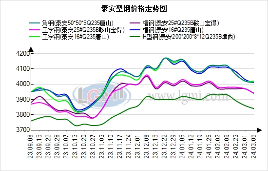 据兰格钢铁云商平台监测数据显示:截至3月5日,泰安16#工唐山资源主流报价4020元(过磅含税)较昨持稳,16#槽钢唐山资源主流报价4010元(过磅含税),较昨持稳,5#角唐山资源主流报价4010元(过磅含税),较昨持稳;25#工宝得资源主流报价3970元(国标检尺),较昨持稳;25#槽宝得资源主流报价3940元(国标检尺),较昨持稳;H型钢200*200津西资源主流报价3860元(国标检尺),较昨持稳。
