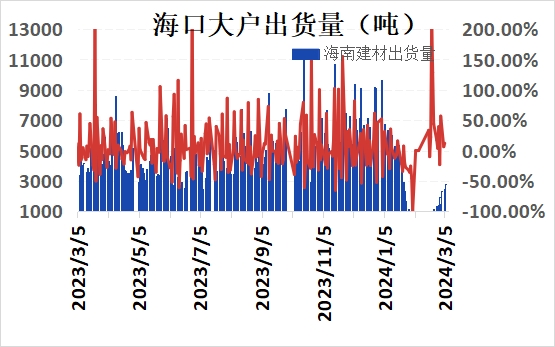 市场方面,今日期螺盘面持续震荡偏弱运行,午后低位窄幅盘整为主,整体小幅收跌。从目前看,市场关注于本月两会利好刺激有限,市场情绪仍然保持悲观运行。加上终端目前的需求来看持续偏弱,市场的信心备受打击,未来几日还需陆续关注政策面影响力度。5日兰格钢铁网调研了解海口地区建材贸易商10家样本贸易商合计出货2800吨,较上交易日增加300吨。预计明日海口建材价格弱稳为主。