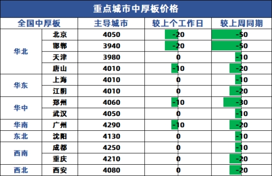 国内中厚板市场价格部分下调,市场需求表现一般,商家出货心态偏弱。北方邯郸、唐山、天津等地价格局部下调,需求面表现一般,商家出货积极性尚可,但买方多参考期货买入,需求面偏弱;南方市场江阴、上海、杭州等地价格部分下调,市场需求表现一般,商家出货多执行让利价格,买方按需采购,大多仅询盘为主。