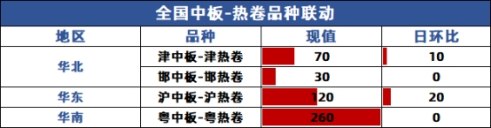 品种价差变化不大,由于期货持续下行,拉动热卷价格下滑,中板跟进速度较慢,仅部分区域价格下调,目前中板价格高于热卷70-260元左右。
