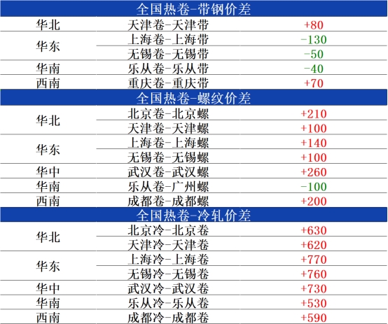 产品价差方面,卷带部分区域价差窄幅震荡,热卷与螺纹部分区域价差有所收窄,冷卷与热卷价差小幅增加。