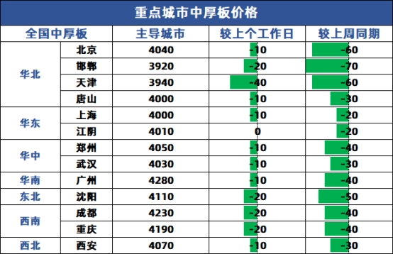 国内中厚板市场价格下行,市场需求面表现一般,商家出货较少。北方邯郸、唐山、天津等地价格下调,商家出货意向较浓,让利为主,但买方需求偏弱,采购情绪一般;南方市场江阴、上海、杭州等地价格大部分区域下调为主,需求面略显平淡,部分商家微刺激出货,让利幅度较大,但仍难达到出货预期,市场交易表现一般。