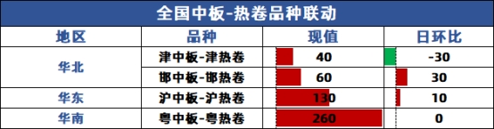 品种价差稍有变阿虎,由于期货持续下行,拉动热卷价格下滑幅度较大,中板跟进速度较慢,仅部分区域价格下调,目前中板价格高于热卷40-260元左右。