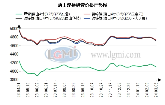 3月6日,唐山市场焊管镀锌管价格部分继续下跌。据兰格钢铁云商平台监测数据显示:焊管4寸(3.75mm)价格为4100元暂与上一交易日持平;镀锌管4寸(3.75mm)正金元4730元,唐山华岐4700元,正大4700元,部分下跌20-30元。