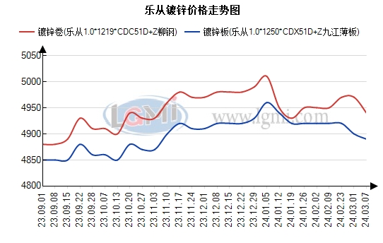 乐从地区镀锌板卷价格主稳运行。据兰格钢铁云商平台监测数据显示,现镀锌1.0mm价格:宝钢湛江5310元,本钢4890元,鞍钢4950元,首钢凯西4600元,攀钢5240元,马钢5120元,柳钢4940元,首钢5110元,九江薄板4890元,华津4550元,含税。