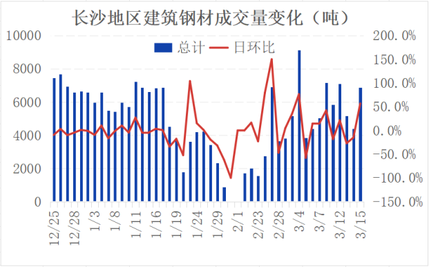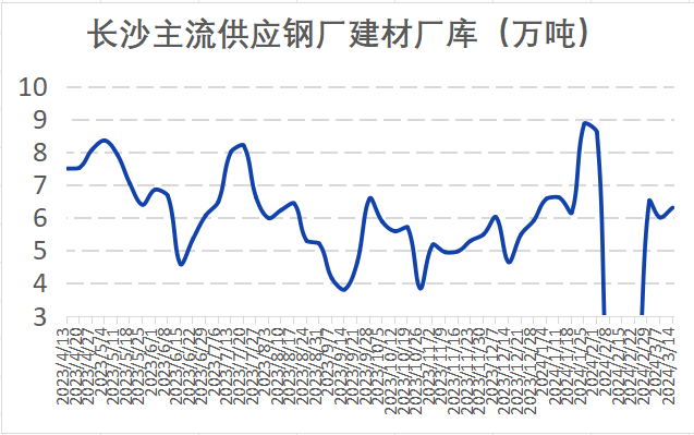 库存方面,长沙建材社会库存小幅降库,截止3月14日,长沙建材社会库存为44.33万吨,较上周同期减少0.17万吨,其中螺纹钢28.94万吨,盘线15.39万吨,盘线占比34.7%。