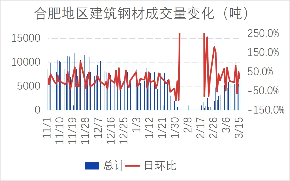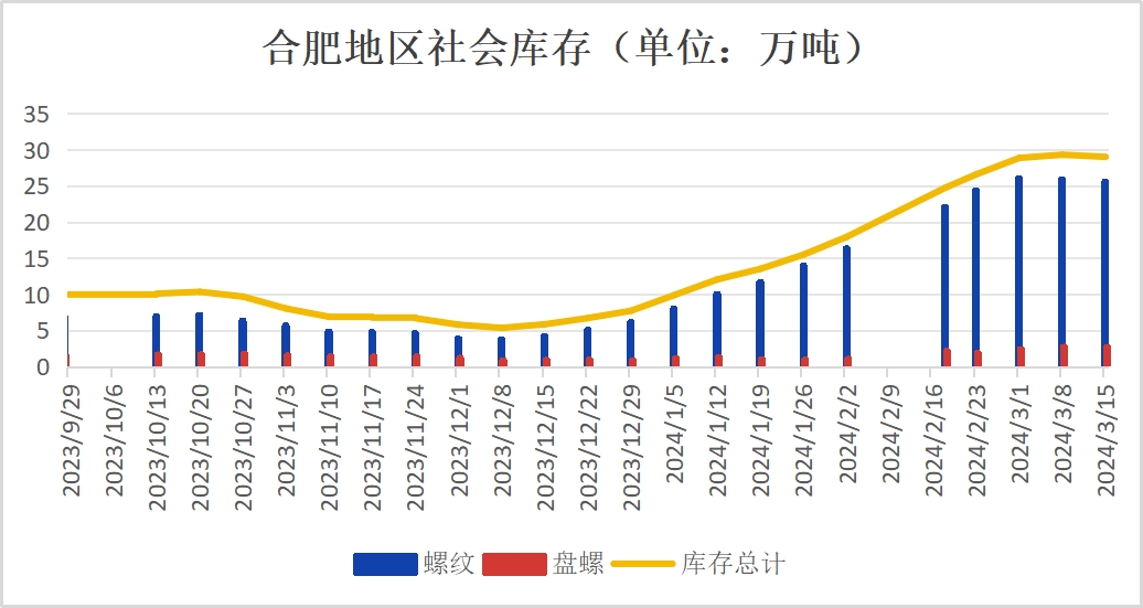 库存方面,本周合肥建材社会库存微微减少,垒库转为降库。截止3月15日,合肥建材社会库存为29.01万吨,较上周五减少0.3万吨,下降1.02%。其中螺纹钢25.64万吨,减少0.29万吨,下降1.12%;盘螺2.77万吨,减少0.01万吨,下降0.36%。从库存变化来看,螺纹略减少,盘螺基本持平。
