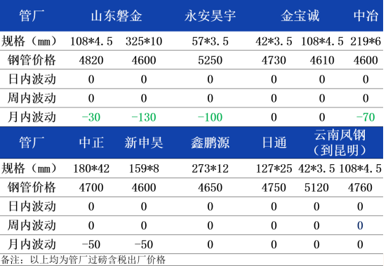 今天主流无缝管出厂报价持稳,周末期间上游原料价格继续走低,部分管厂接单价格窄幅下调,个别市场价格跟随下跌,商家心态依旧偏空,市场资源流转速度缓慢。今天盘面有反弹迹象,但目前无缝管价格仍有下探空间,商家比较谨慎,多趁机销售降库为主,预计今天无缝钢管价格继续补跌。