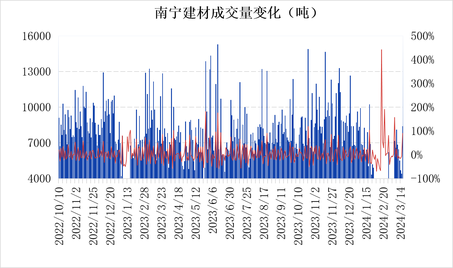 今日区内建材市场价格表现各异,有品牌价格持稳,部分代理商报涨;也有品牌为继续降库走量,优惠继续拉大,品牌间价格差扩大到100元上下。针对市场需求不好,行情预期较为悲观,市场代理提货动力不足,据了解,各家库存差距下限200,上限2万左右。无论是低库存还是高库存,目前都是悲观心态。商家库存低是“摆烂”,库存高是被“累库”,都是被市场或产业链压迫下做的被动选择,反映了市场交易环境的错配。市场成交因盘面止跌,投机需求释放尚可。18日兰格钢铁网调研统计南宁地区17家样本建材贸易商合计出货8400吨,较上一个交易日增加3980吨。
