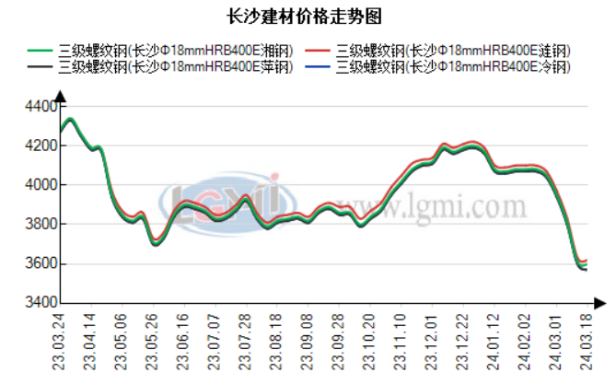 今日长沙建材价格补跌。据兰格钢铁研究中心监测显示:截至18日,长沙建材市场HRB400EΦ18mm螺纹钢萍钢3570元,冷钢3570元,湘钢3600元,涟钢3620元。