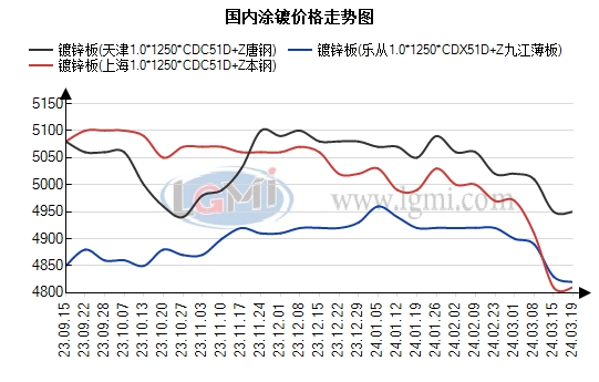 3月19日国内涂镀板卷价格持稳运行。据兰格钢铁云商平台监测数据显示:现国内重点城市1.0mm镀锌板平均价格4833元,较上一个交易日价格持平。其中,天津1.0mm镀锌板价格5130元,较上一交易日价格持平;上海1.0mm镀锌板价格4810元,较上一交易日价格持平;乐从1.0mm镀锌板价格4850元,较上一交易日价格持平。现国内重点城市0.47mm彩涂板平均价格5937元,较上一个交易日价格持平。其中,天津0.47mm彩涂板价格5300元,较上一交易日价格持平;上海0.47mm彩涂板价格6600元,较上一交易日价格持平;广州0.47mm彩涂板价格6300元,较上一交易日价格持平。