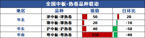 南北价差有所变化,北方市场以邯郸、唐山为主,南方市场以江阴、上海等地为主,邯郸和江阴价差在60元,江阴较高;上海和唐山价差在40元。