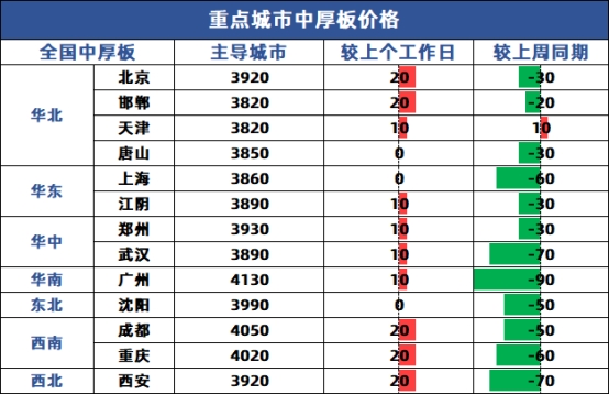 国内中厚板市场价格部分走高,业者心态尚可,商家报盘积极性提高,市场交易较昨日稍弱。北方邯郸、唐山、天津等地价格上调,业者对市场预期增加,交投氛围较上周表现尚可;南方市场江阴、上海、杭州等地价格部分走高,商家出货情绪尚可,市场仍有部分商家有排库需求,价格暂时守稳,不排除后期调涨可能,买方需求尚可,但较昨日稍有减弱。