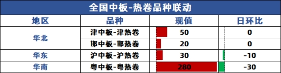 南北价差有所变化,北方市场以邯郸、唐山为主,南方市场以江阴、上海等地为主,邯郸和江阴价差在70元,江阴较高;上海和唐山价差在10元。