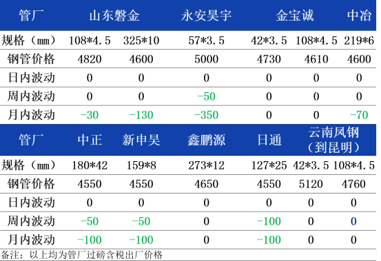 今天主流无缝钢管出厂报价持稳,近两日随着期货盘面的震荡反弹,管厂出货情况明显好转,市场商家有少量抄底的操作,但是多数商家依旧是趁机降库为主,且市场价格上探后,出货略显不畅,下游终端对于当前价格上涨仍需时间接受。今晨期钢盘面飘红并有继续上探之势,加上上游管坯价格支撑,预计今天无缝钢管市场价格稳中有涨。